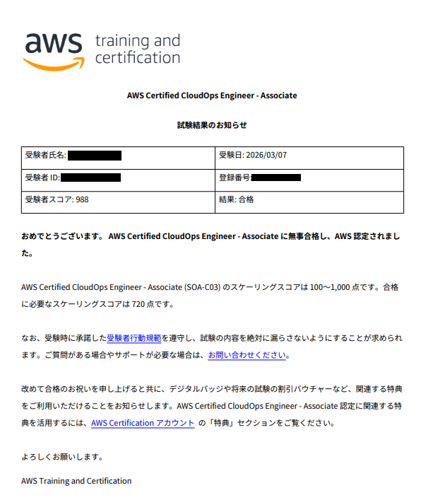 AWSのシステム保守・運用者中級者レベルの資格であるAWS CloudOps Engineer Associateの試験を受けてパスしたのでレポートしておきたいと思います。